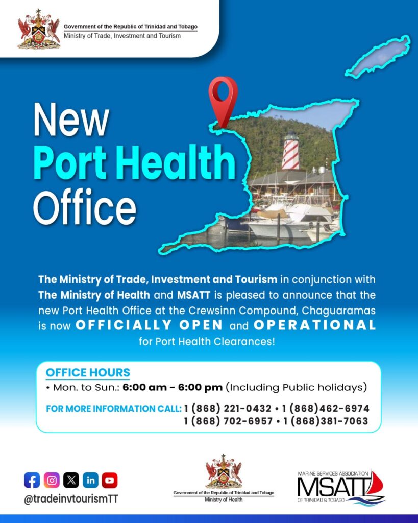 The Ministry of Trade, Investment and Tourism, in collaboration with the Ministry of Health and the Marine Services Association of Trinidad and Tobago (MSATT), is pleased to announce that the new Port Health Office located at the Crew’s Inn Compound, Chaguaramas, is now officially open and operational.